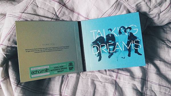 但是撇除翻譯不談,這張Talking Dreams真的非常夏天午後,舒服輕快像是包含無限的青春。所以專輯設計上,他們的色調挑的是清爽的蘋果綠與琉璃藍,配上乾淨的成員圖就這樣交差了事了(。